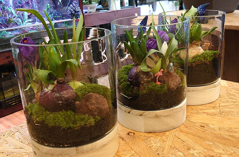 ワークショップの案内の写真では、水仙の球根と木の枝?等を組み合わせた、ちょっと大人っぽい感じの寄せ植え。サイズ感がわからず、水仙の大きさからすると、デスクまわりに置くには少し大きそうかな?と感じていました。