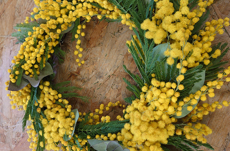 葉っぱやふわふわのお花の部分を切り離してから、土台となるリースに・・・方向を整えながら、ミモザの葉や花を付けていきました。最初はバランスを気にしていましたが、徐々にそれどころではなくなり、ひたすら集中して作業。