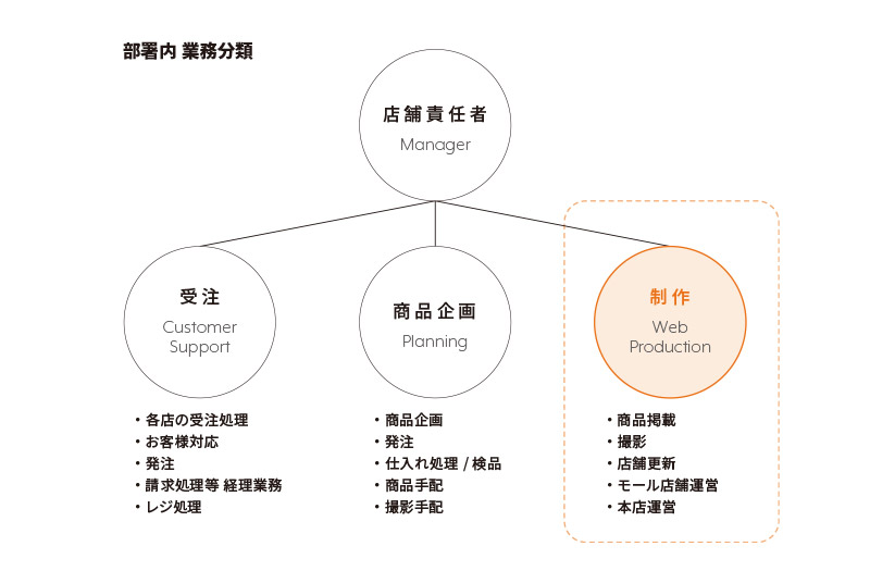 | スタッフ | 制作8名、受注5名、バイヤー1名、店舗責任者1名 ※出荷は外部業者 |